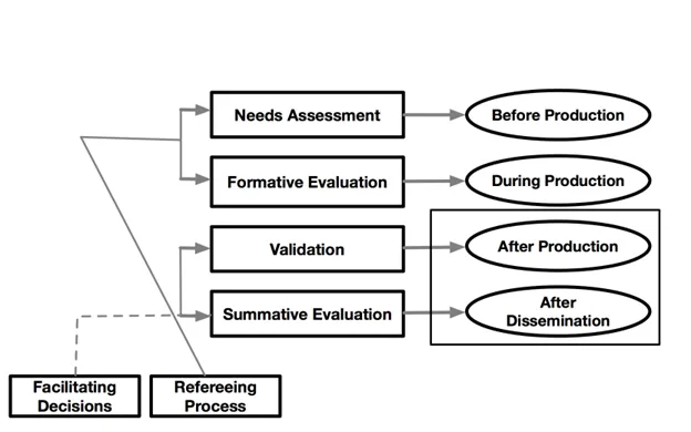 The facilitative method consisted of four phases: the first phase occurred before a producer began production of a program; the second phase took place during the program’s production; the third phase followed the completion of the program; and the fourth phase was conducted after the program had been presented to its intended audience. Figure 7.3 below illustrates ERTI’s evaluation process and the terms used for each of its functions.